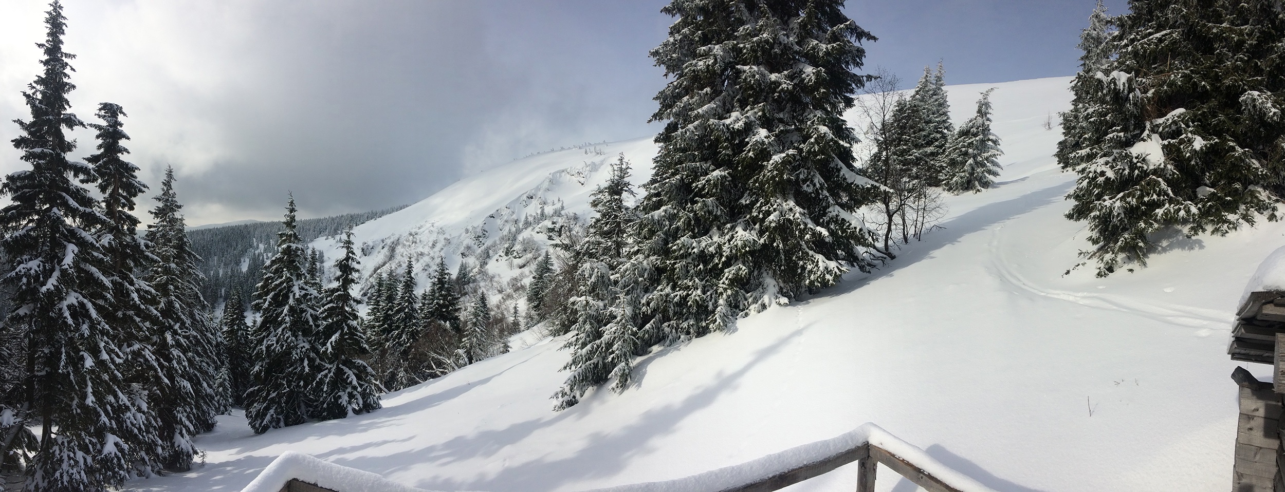 Podmínky naprosto famózní, cca 15-25 cm čerstvého prašanu, pod tím stabilní sníh, poloazuro ... prostě paráda. Cca po 3 a půl hodinách na vrcholku Vysoké hole, cestou jsem potkal jen jednoho snowboardistu a 2 kamzíky :)