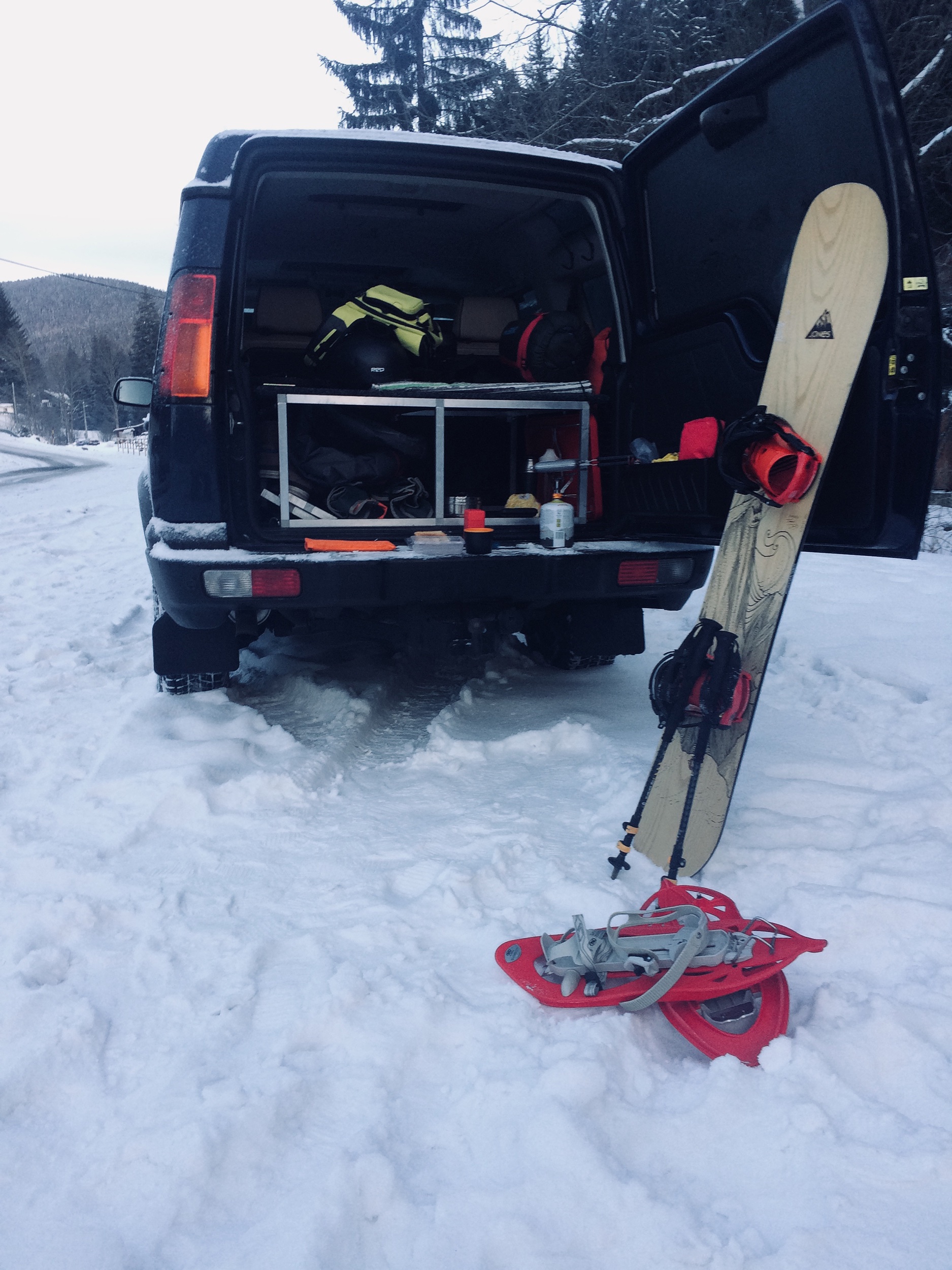 V pátek večer z Brna směr Karlov pod Pradědem, noc v –12 stupních, ráno v 6:30 budíček, uvařit čaj, upéct tousta, nasadit sněžnice, prkno na záda a hurá vzhúru do velkého kotle.