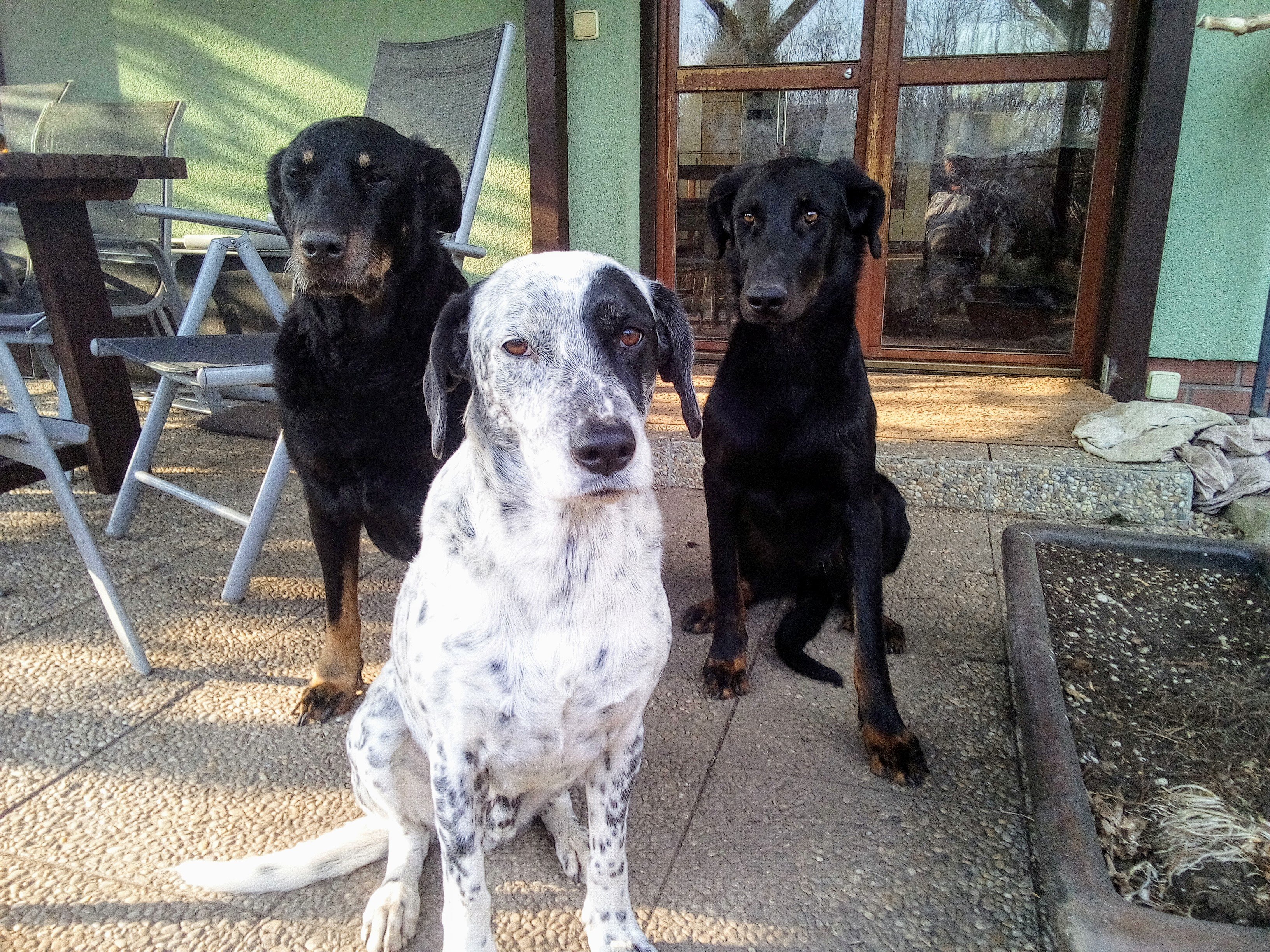 V neděli se mi podařilo vyfotit své tři hafy. Ty dvě černé jsou Beauceronky,Amy 14 let a dva měsíce,Barča 17 měsíců a to kropenaté zlatíčko je Koudík 6 let