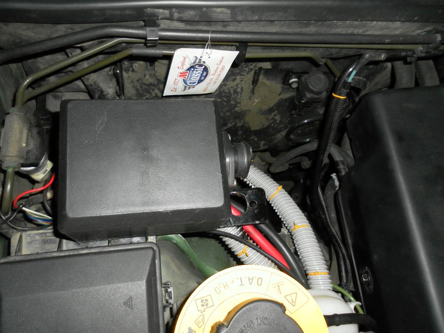Pro přiblížení - drží to za držák webasta, držák bezpečnostního vypínače auta (pro případ převrácení, vypínač se přemístí na tenhle novej držák baterie) a držák EGR modulátoru (ten musí pryč, stejně při vyndaném EGR ventilu je k ničemu). Dál se musí uříznout jeden ze šroubů co drží pojistkovou skříňku (jsou tam dva vedle sebe).