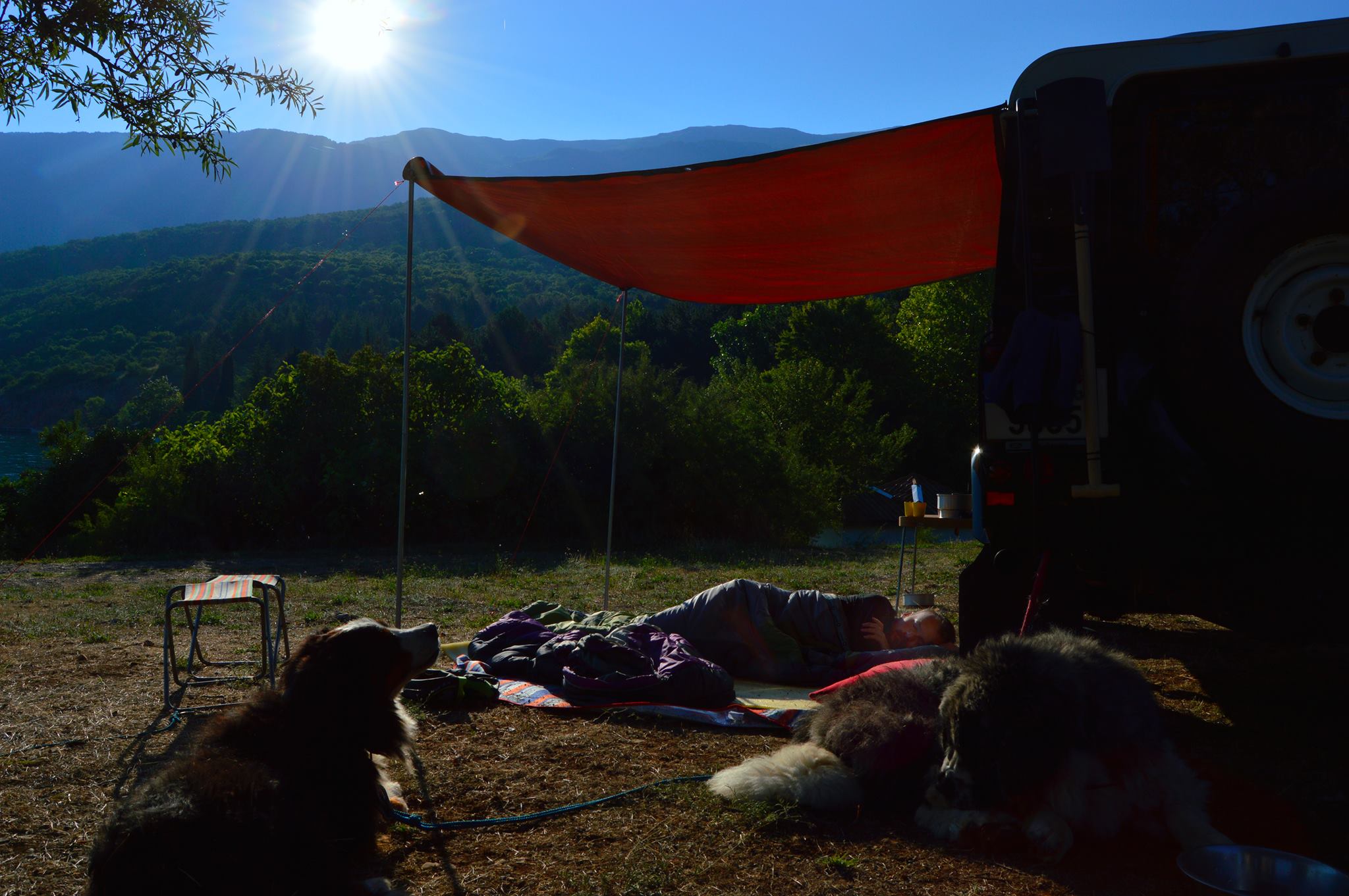 Já měl na freečku podobné řešení jako Adam. Vojenskou plachtu a teleskopické tyčky ke stanu, kotvil jsem to k hagusům, vypadalo to podobně, jako to má Adam.