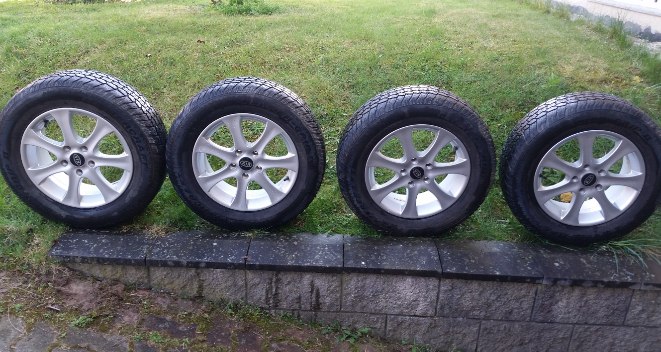 Parádní kola, de fakto netčené. Původně Kia, nyní včetně distančních kroužků na Freečko, ET 40. Měl jsem je krátce, když jsem chtěl leštěnku. Pneu 215/65/16 zimní, pěkný vzorek ale starší, tj. spíš na dojetí v létě.