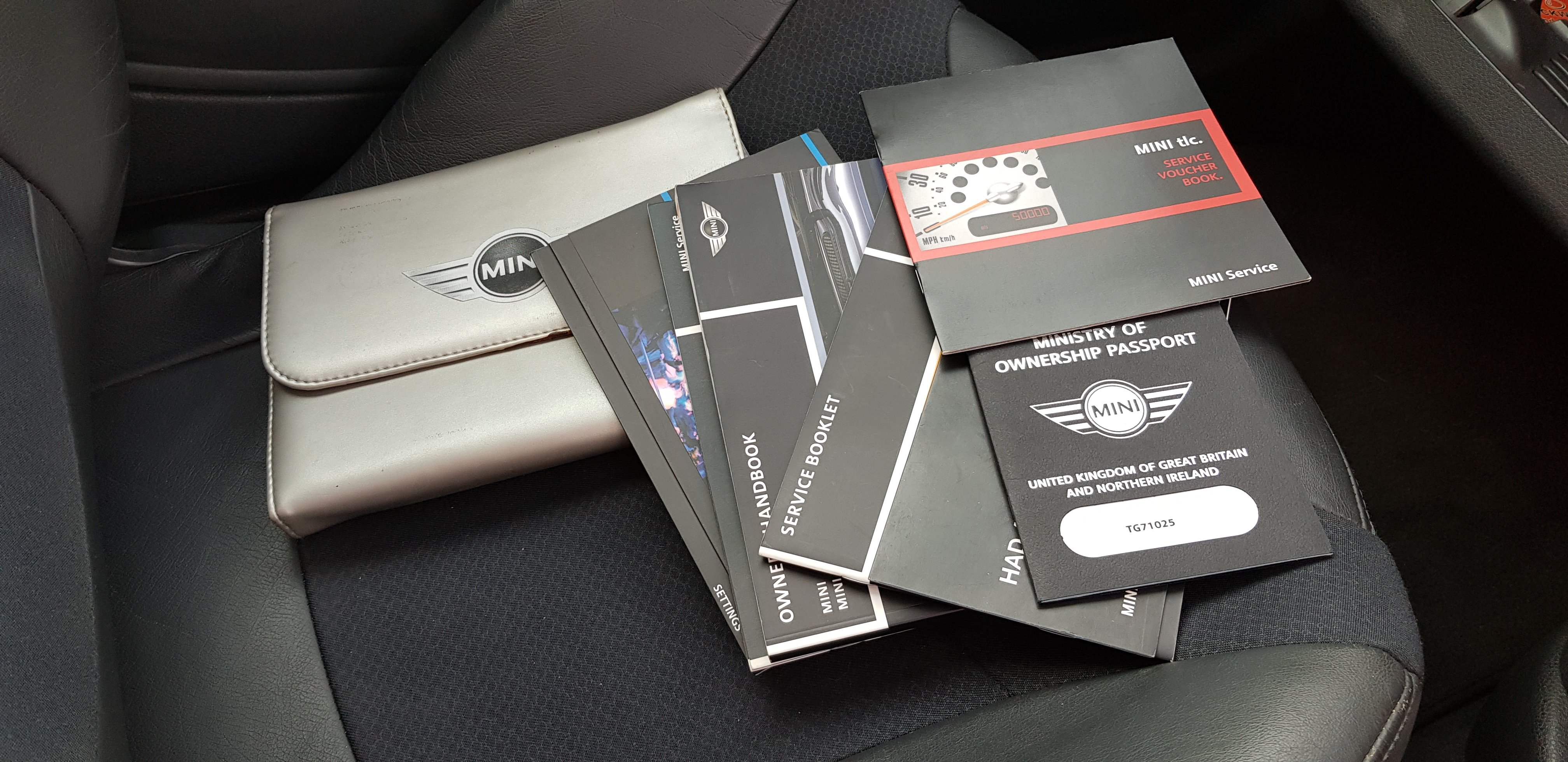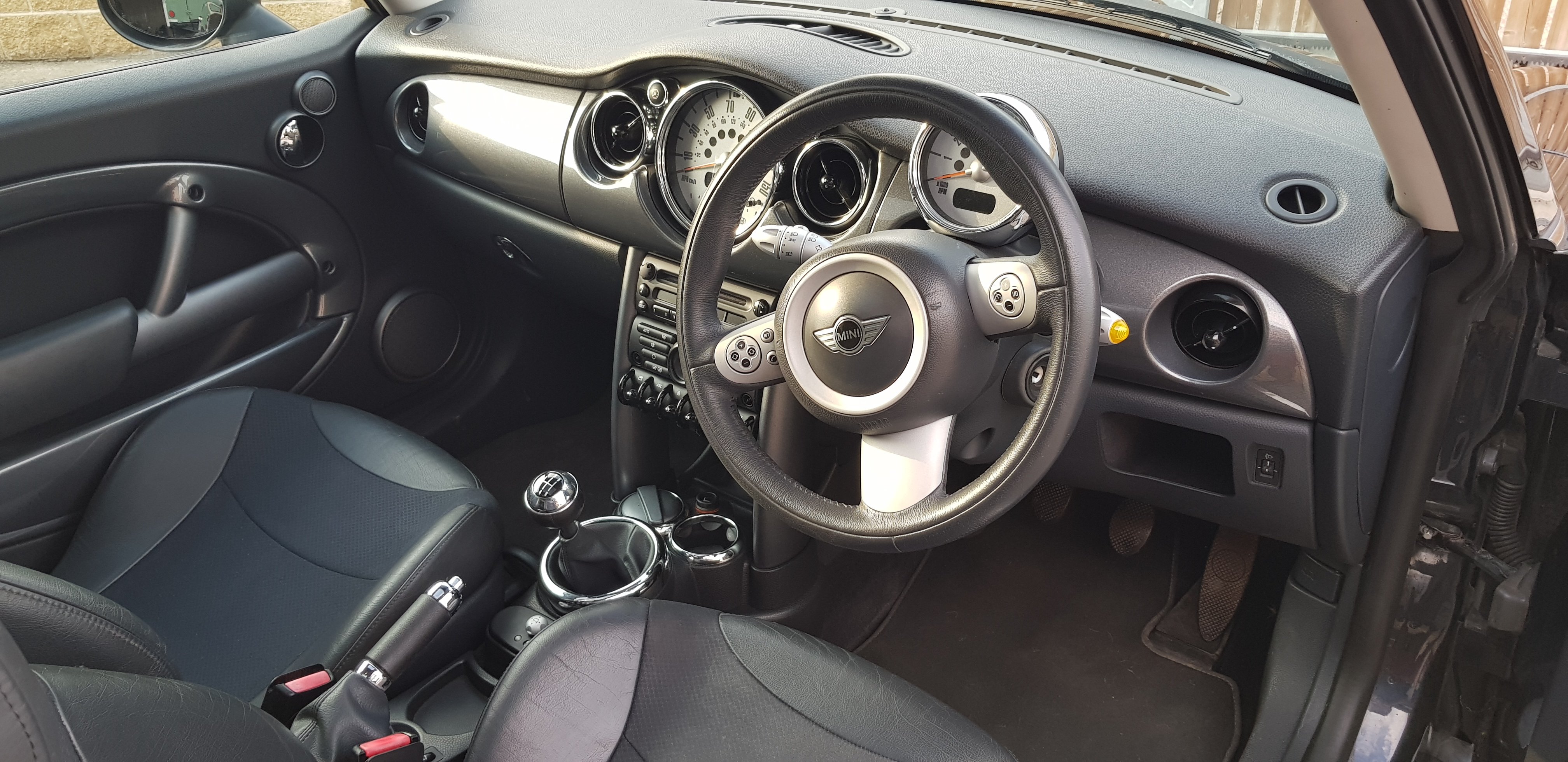 další co je tu navíc je Mini Cooper, rok výroby 2005, model R50 facelift, motor W10 1.6 benzín 85kW (116 koní), manuální převodovka, černá metalíza ASTRO BLACK, černý polokožený interiér. RHD, takže volant na pravé straně. Najeto 121.500mil.