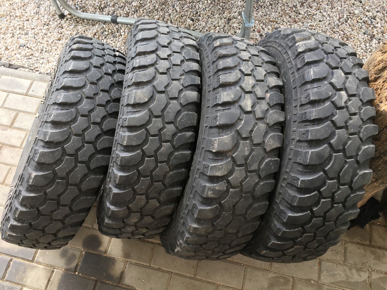Koupil jsem sadu defáckých disků a jsou na nich použitelné pneu Matador Wisenta 235/85 R16, 2 ks s vzorkem 8-9 mm, 2 ks 5-6 mm. Nejsou popraskané ani nijak viditelně poškozené a vzduch drží.