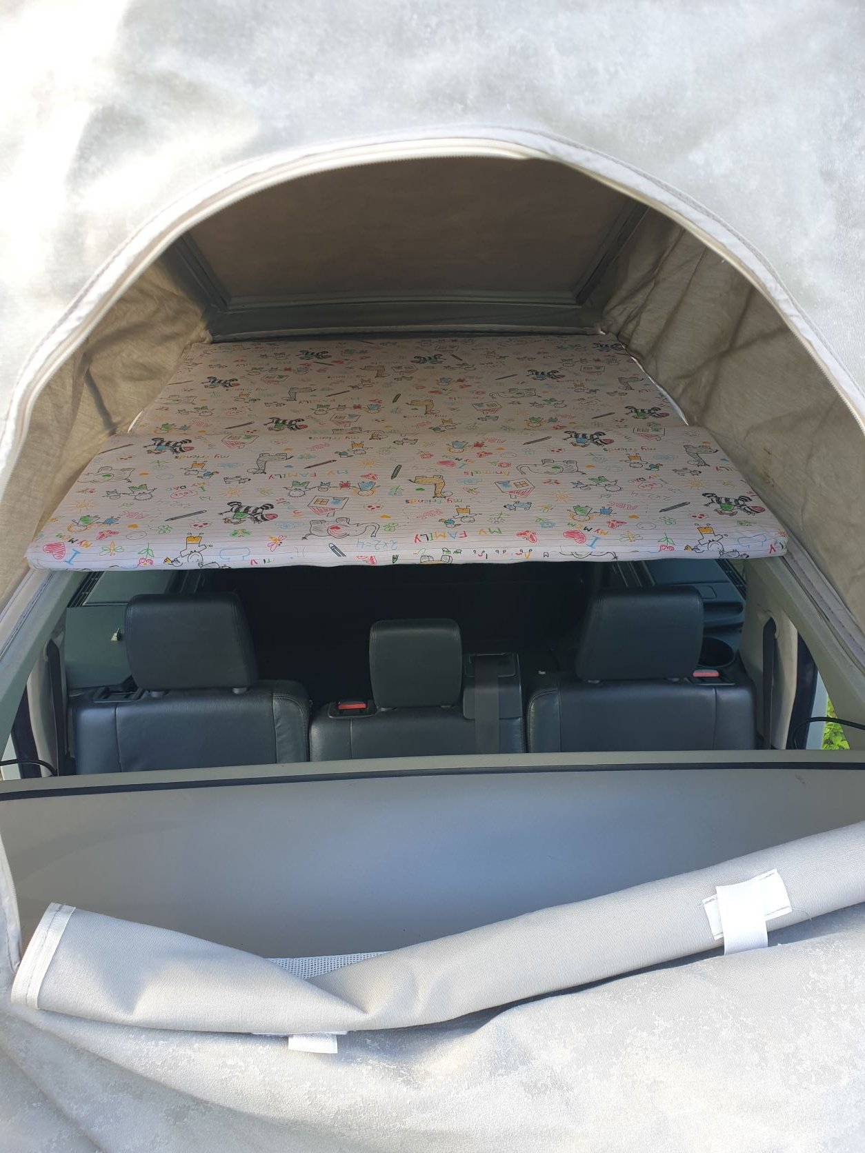 Přidávám tedy fotky vnitřku ke spaní. Rozměry: délka 200cm, šířka 100cm, výška v nejvyšším bodě 110cm; pro jedno je to pohodlné spaní, nahoře se dá i oblíct, v noci jsem běžně chodil ven vrškem abych dole nikoho nebudil. A nad vašimi hlavami si můžete všimnout krásného potahu z 21.století s ještě krásnějším motivem, který vybírali místní děti