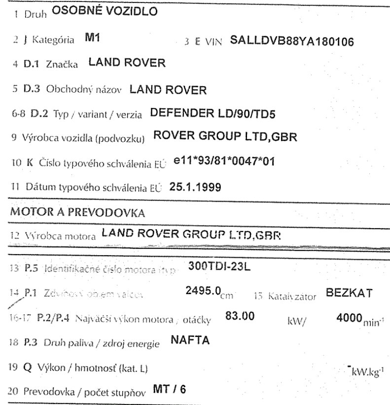 To je ale divný, že v tom techničáku je nahoře napsáno DEFENDER LD/90/TD5, podle VIN dekodéru byl vyroben s motorem Td5, v papírech je motor TDi, ale v autě je opravdu TD5-ka.